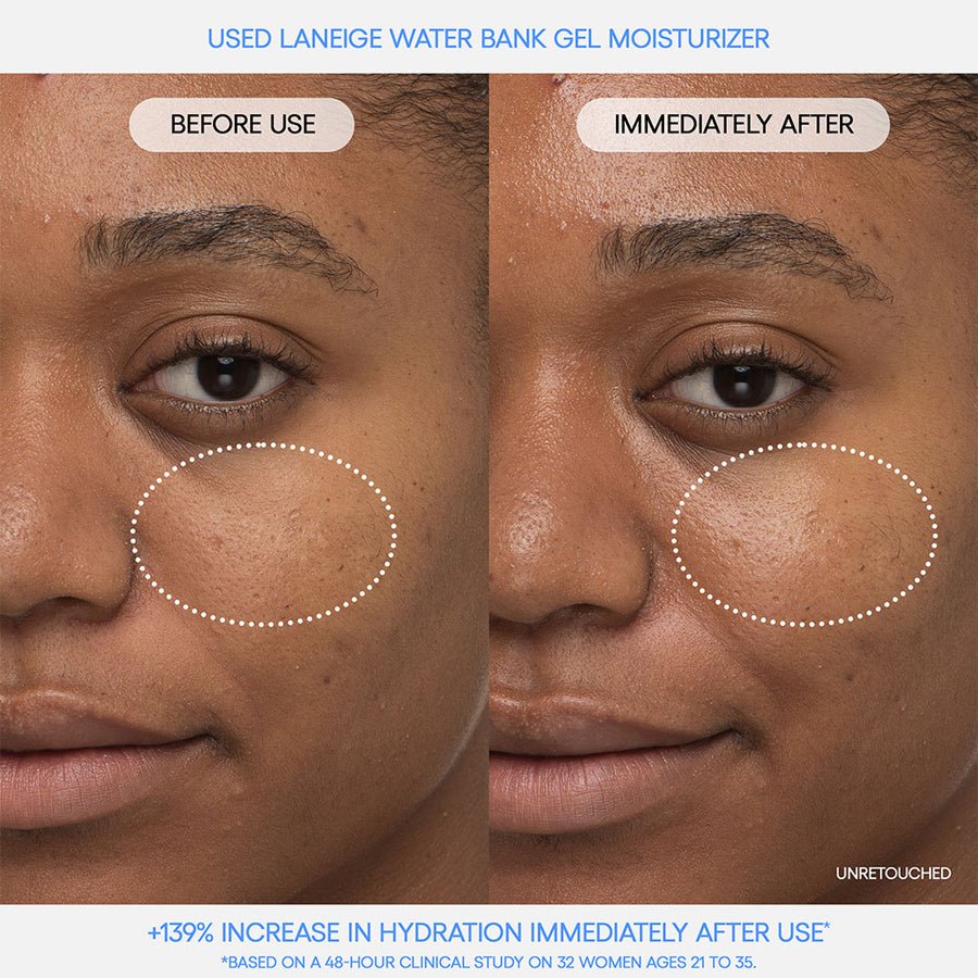 LANEIGE Water Bank Blue Hyaluronic Gel Cream is a refreshing gel moisturizer designed to provide deep hydration while maintaining a lightweight feel. Formulated with micro-sized Blue Hyaluronic Acid, fermented with deep-sea algae, and refined through a 10-step microfiltration process, it ensures rapid absorption and long-lasting moisture. The inclusion of betaine and mint leaf extract helps to balance oil and moisture levels, offering a cooling sensation that soothes the skin. Clinical studies have demonstrated a 139% increase in skin hydration immediately after use and a 6.3°C reduction in skin temperature, highlighting its efficacy in hydrating and calming the skin.