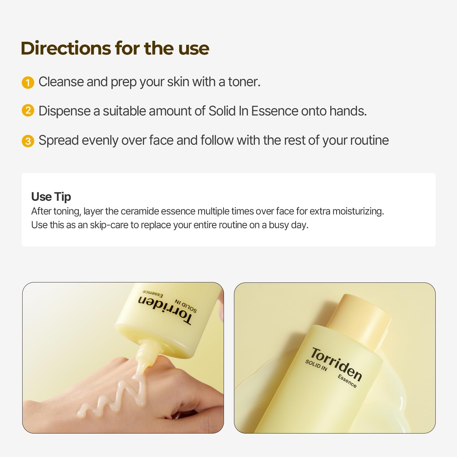 Torriden Solid-In Ceramide All Day Essence is a fast-absorbing, non-sticky ceramide essence with 5 ceramides and panthenol for barrier repair, deep hydration, and daily soothing.